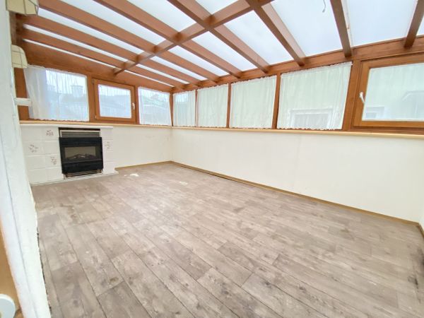 Alle Räume sind mit Fischgrät Parkettboden ausgestattet. Die Küche und das Badezimmer mit Fliesen. Die überdachte Terrasse wurde mit einem PVC Boden versehen.