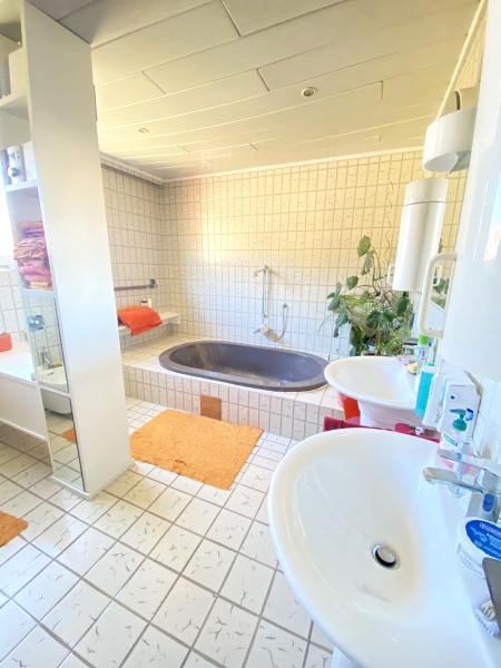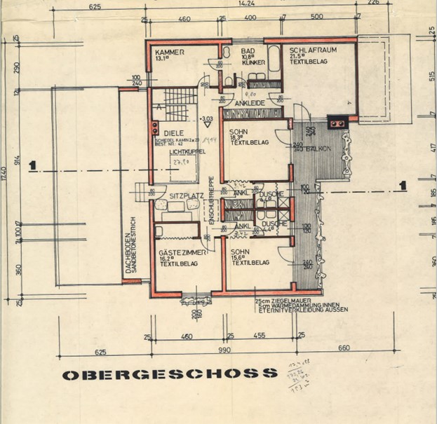 Neben dem Hauptschlafzimmer befinden sich 2 weitere Zimmer mit Ankleide und 2 weitere Bäder inkl. Dusche und WC sowie ein derzeit offenes Arbeitszimmer (am Plan Gästezimmer) im Obergeschoss.