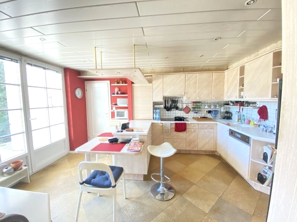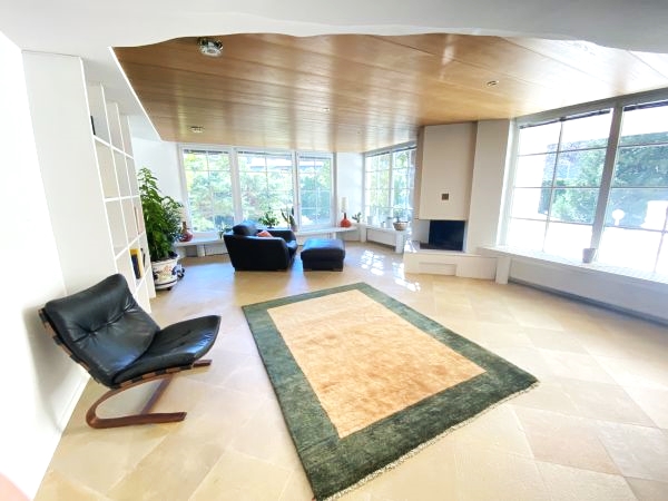 Über die Küche erreichen Sie ebenso wie über den Vorraum das ca. 24 m² große Esszimmer und das ca. 55 m² große ensuite Wohnzimmer mit gemütlichem Kamin und Bar. Die beiden Räume sind mit Glasfronten versehenen und gewähren einen traumhaften Panoramablick Richtung Terrasse und in den Garten. Hier lassen sich sowohl im Sommer als auch im Winter gesellige und erholsame Tage verbringen.
