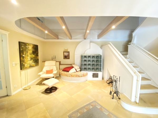 Eine elegante Steintreppe führt Sie vom Vorraum, der ebenfalls mit einer gemütlichen Sitzecke und einem herrlichen Kachelofen ausgestattet ist, in den 1. Stock.